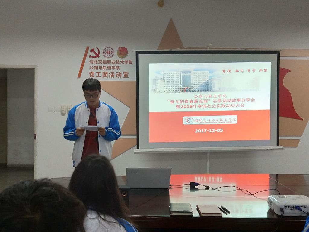为深入贯彻学习党的十九大精神,践行社会主义核心价值观,传递青春正能量,在第32个国际志愿者日到来之际,12月5日下午,公路与轨道学院分团委举办了“奋斗的青春最美丽”志愿服务故事分享会暨2018年寒假社会实践动员大会。公轨学院分团委老师、学生干部、各班团支部代表共110余人参加了活动。