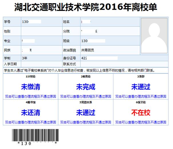 ⑴学生本人通过对个人毕业信息以及6项离校项目进行核查,若发现离校单信息不符的情况,可与相关部门联系(