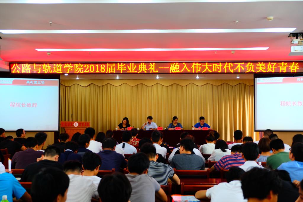 融入伟大时代,不负美好青春。2018年6月14日上午10点,公路与轨道学院2018届学生毕业典礼在培训楼三楼多功能厅隆重举行。参加此次典礼的有学院总支书记、院长程海潜,党总支副书记朱婧,副院长杨帆,副院长沈力,以及辅导员、教师代表、2018届毕业生和在校生代表。典礼由朱婧主持。