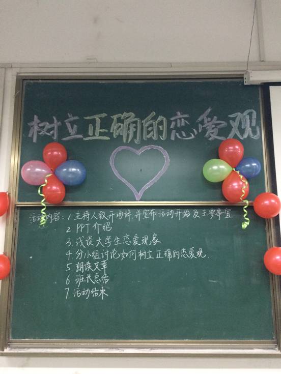 通过一系列的活动和幻灯片展示,使同学们树立正确的爱情观,人生观,并且在以前的基础上提高,升华。加强同学们的心理承受能力,正确的方式,树立同学们正确处理好学习与爱情的关系,分清主导地位和次要地位。促使形成正确的恋爱观,实现学业和爱情双丰收。要慎重对待恋爱,不要操之过急,多给学习一点时间。让同学们明白大学期间即使恋爱也要注意交往方式和交往尺度,学会自我保护,拒绝不良行为和生活方式。