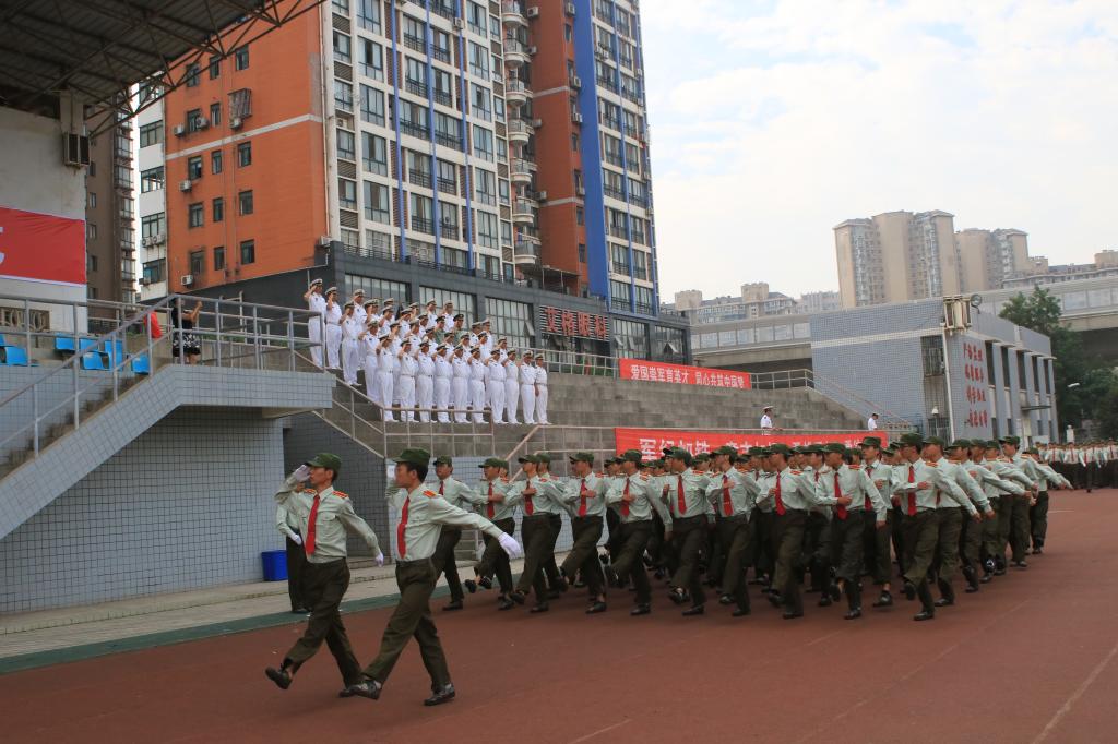 伴随着雄壮的国歌响起,本次阅兵式正式拉开序幕。只见我院学子们气宇轩昂,英姿飒爽,迈着整齐的步伐通过主席台,接受学校领导、老师和教官的检阅。经过主席台时,他们迅速将头摆向主席台一侧,把坚毅的目光投向主席台上的领导嘉宾,整齐的队列,铿锵有力地踢着正步,主席台前回荡着他们嘹亮的口号,充分展现了2016级公轨学子良好的精神风貌。紧接着是精彩的军体拳表演、海军旗语表演、以及直招士官会操表演仪式。